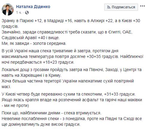 Она отмечает, что в Киеве сейчас жарче, чем в Париже, Мадриде и Алжире: если там +12, +16 градусов и +22 градуса соответственно, то в украинской столице – +30 градусов.
