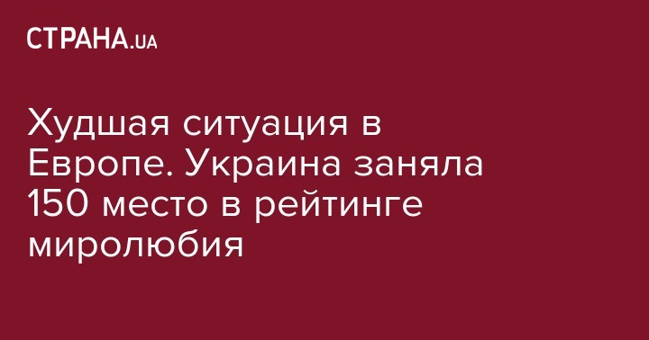 Лондонский институт экономики и мира (IEP) опубликовал актуальный рейтинг стран мира по индексу миролюбия. В 2019 году Украина поднялась еще на две позиции вверх, заняв 150 место в мире - между КНДР и Суданом. Об этом сообщает Deutsche Welle в среду, 12 июня.