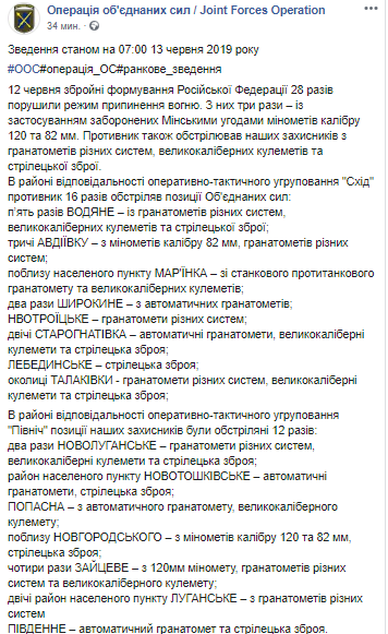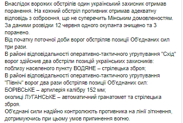13 июня пресс-штаб Операции Объединенных сил (ООС) обнародовал сводку за прошедшие сутки на Донбассе. Данные размещены в ежедневном отчете на странице штаба ООС в Facebook.