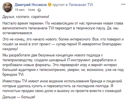 "Мы разработали две безумные концепции нового подхода к телепроизводству, создали шикарный IT-инструмент, разработали и опробовали новые форматы. Это перевернёт игру и вернёт интерес большой аудитории к телесмотрению, уверен, но, возможно, уже не под брендом TVi. Инвесторы TVi имеют иное видение использования бренда и лицензий, которые удалось купить и перезапустить за последние полгода. Я полностью продаю свою долю и выхожу из проекта вместе с командой", - написал Носиков.