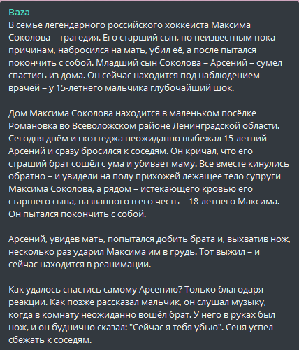 Версия с убийством основывалась на показаниях младшего сына Максима – Арсения. По словам источника, он прибежал к соседям и сообщил, что его старший брат сошел у с ума – пришел убить его, но он убежал, а затем кинулся на мать. Когда Арсений вернулся, тот в состоянии аффекта попытался добить старшего брата, который до этого якобы неудачно решил покончить жизнь самоубийством.