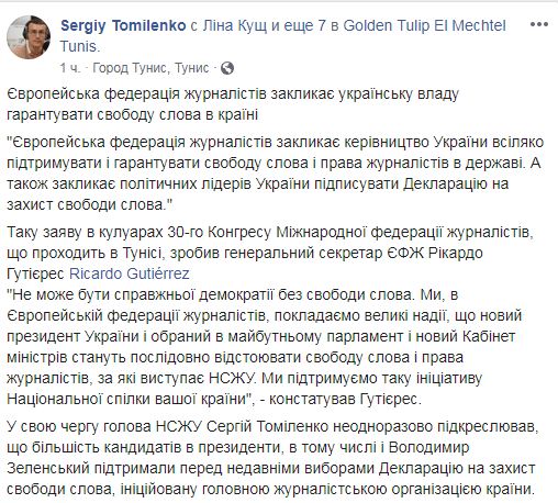 Европейская федерация журналистов (ЕФЖ) призывает руководство Украины всячески поддерживать и гарантировать свободу слова и права журналистов в стране. Такое заявление в кулуарах 30-го Конгресса Международной федерации журналистов, проходящего в Тунисе, сделал генеральный секретарь ЕФЖ Рикардо Гутиерес, пишет глава НСЖУ Сергей Томилекно в Facebook.