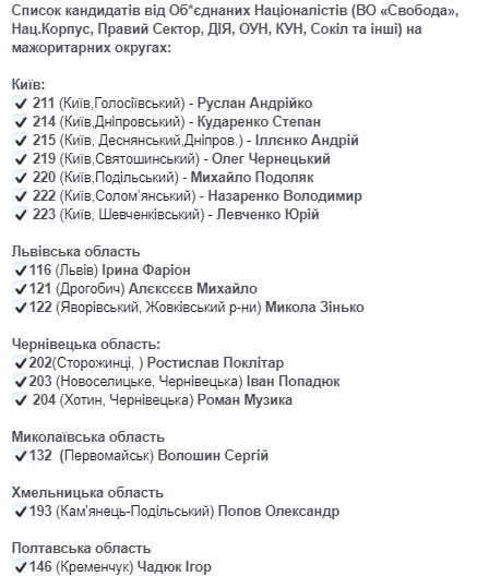 Список кандидатов от Объединенных националистов на мажоритарных округах: