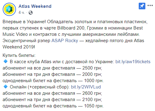 В Киеве меньше чем через месяц стартует один из крупнейших музыкальных фестивалей Украины Atlas Weekend, его организаторы сообщили имя музыканта, который выступит хедлайнером заключительного дня 13 июля. Это популярный рэпер A$AP Rocky. об этом говорится на официальной странице организаторов в Facebook.