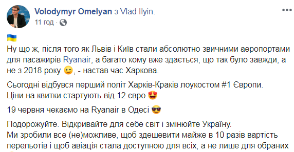 19 июня ждем Ryanair в Одессе. Путешествуйте. Открывайте для себя мир и меняйте Украину. Мы сделали все (не)возможное, чтобы удешевить почти в 10 раз стоимость перелетов и чтобы авиация стала доступной для всех, а не только для избранных", - написал министр.