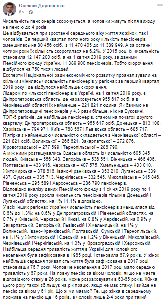 За первый квартал 2019 года количество пенсионеров уменьшилось на 80 456 человек, с 11 470 405 до 11 389 949. А за последнее 4 года их количество сократилось на 4,2%. В 2015 году численность пенсионеров составляла 12 147 200 человек, а на 1 апреля 2019 года, по данным Пенсионного фонда Украины, 11 389 900 пенсионеров. То есть произошло сокращение на 750 тысяч человек.
