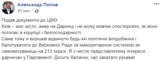 Сегодня, 18 июня, бывший председатель Киевской городской государственной администрации Александр Попов (2010-2014) подал документы в ЦИК. Он будет баллотироваться в Верховную Раду по мажоритарной системе как самовыдвиженец на 212 округе. Об этом он написал на своей странице в Facebook.