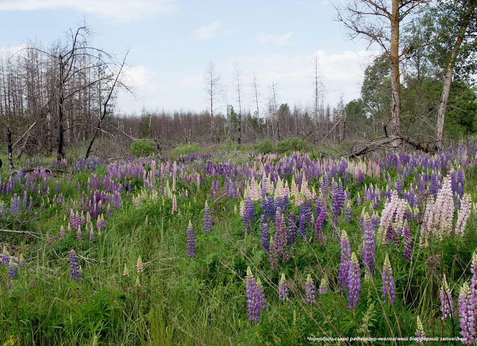 На третьем и четвертом фото - поляна люпина. Это растение семейства бобовых, его еще называют "волчий боб". Интересно, что в цветках люпина содержится около 50% белка, 20% масла, которое по качеству близкое к оливковому. Несмотря на то, что семена люпина с древних времен используется в пищу человеком и на корм животным, данные цветки нельзя использовать из-за произрастания в радиационном фоне.