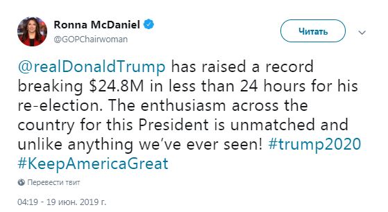 Президент США Дональд Трамп собрал $24,8 млн пожертвований в первый день своей избирательной кампании. Об этом сообщила глава Национального комитета Республиканской партии США Ронна Макдэниел в Twitter.
