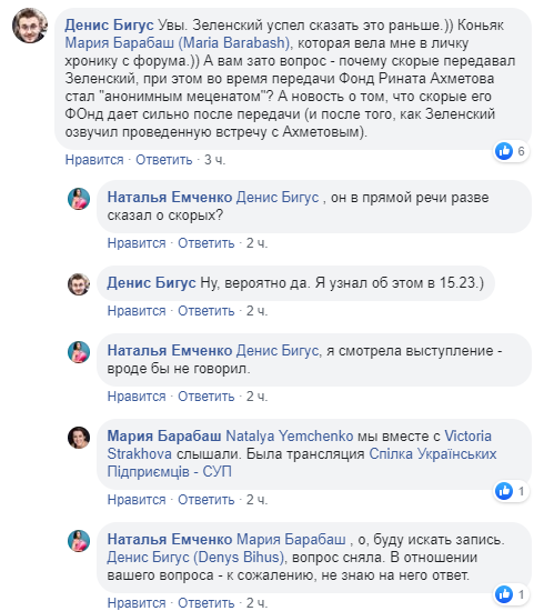 Бигус написал, что сам Зеленский успел сказать это раньше, на форуме. И задал несколько вопросов: почему скорые передавал Зеленский, при этом во время передачи Фонд Рината Ахметова стал "анонимным меценатом", а также, почему новость о том, что скорые его Фонд дал через 4 дня после передачи и после того, как Зеленский озвучил информацию о проведенной встрече с Ахметовым.