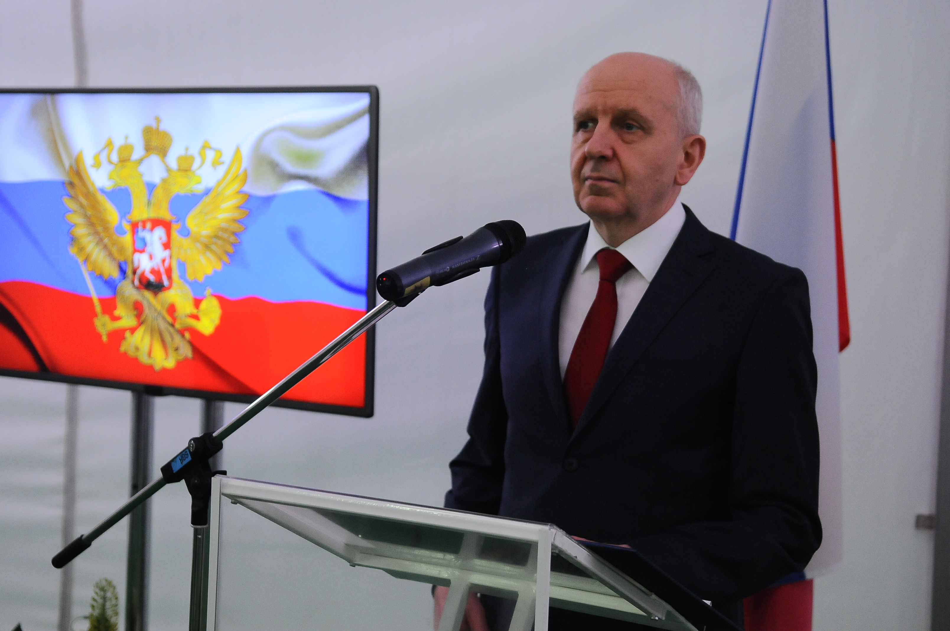 Посольский прием 2019 года. Александр Лукашик в бордовом галстуке. Монитор рядом с трибуной