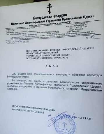 Сообщается, что "10 июня иеромонах Андрий Горчаков, секретарь Богородской епархии бывшей УПЦ Киевского патриархата… отметил годовщину своего монашеского пострига, а также принял участие в праздновании Дня России в Киеве".
