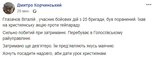 "Глазачов Виталий, участник боевых действий с 25 бригады, был ранен. Ехал на христианскую акцию против гейпарада. Сильно избит при задержании. Находится в Голосеевском райуправлении. Задержаны еще девять. Им предъявляют какой-то бред. Хотят посадить надолго, чтобы дать урок христианам", - написал Корчинский.