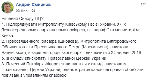 В ПЦУ также приняли решение за участие в действиях, "направленных на возникновение противостояния", исключить из состава епископата ПЦУ митрополита Белгородского и Обоянского Иоасафа (Шибаева) и епископа Валуйского, викария Белгородской епархии Петра (Москалёва).