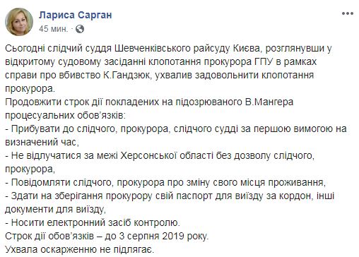 "Сегодня следственный судья Шевченковского райсуда Киева, рассмотрев на открытом судебном заседании ходатайство прокурора ГПУ в рамках дела об убийстве Гандзюк, принял решение удовлетворить ходатайство прокурора и продлить срок действия возложенных на подозреваемого Мангера процессуальных обязательств", - написала Сарган.