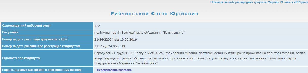 Народный депутат Евгений Рыбчинский, которого на прошлых выборах избрали по 211 округу в Киеве, теперь баллотируется в нардепы от "Батькивщины" по 122 округу во Львовской области. Об этом свидетельствуют данные на сайте ЦИК.