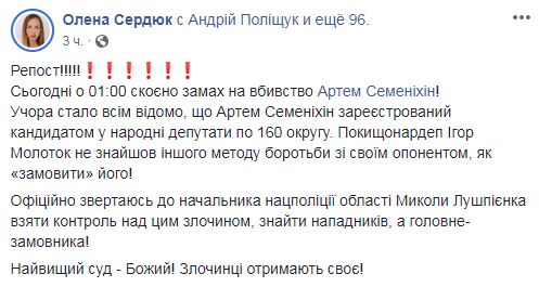 Депутат облсовета Елена Сердюк в Facebook выложила фотографию избитого политика и связала избиение с тем, что он накануне зарегистрировался кандидатом в народные депутаты по 160 округу.
