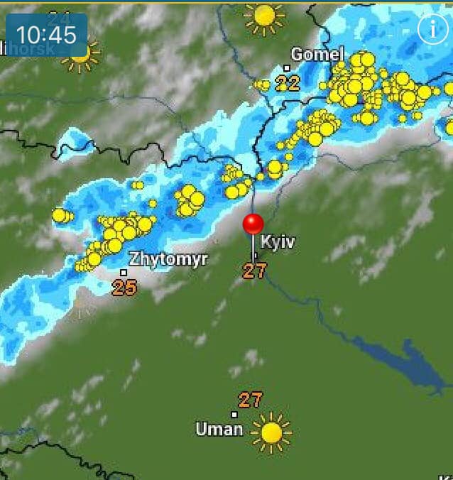 Она также подчеркивает, что в Киеве 27 июня с 12:00 и в ближайшие часы ожидается сильный дождь с грозой, обусловленный приходом атмосферного фронта. Также есть вероятность шквальных порывов ветра и даже града. "На всякий случай закройте все окна, уберите вещи с открытых балконов", – предупредила меторолог.