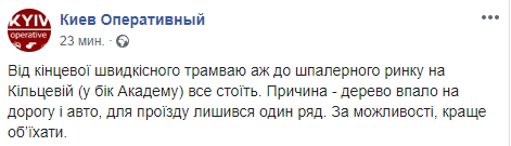 На Кольцевой дороге от конечной скоростного трамвая и до обойного рынка (в сторону Академгородка) дорога стоит из-за упавшего дерева. Для проезда остался один ряд. Об этом в 12:3, пишет Киев Оперативный.