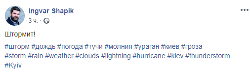 27 июня, после долгих жарких дней, около 12:30 Киев накрыл ливень. Небо затянуло тучами буквально за полчаса, а налетевшая на столицу гроза сопровождался сильными порывами ветра. Буря прошлась по всем районам города. Шторм повалил деревья на дорогу и автомобили, срывал кровли.