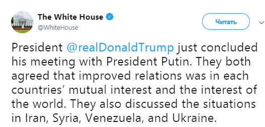 В сообщении Белого дома говорилось, что Дональд Трамп и Владимир Путин обсудили ситуацию в Иране, Сирии, Венесуэле и в Украине. А также, что "оба лидера согласились, что улучшение отношений отвечает взаимным интересам и интересам всего мира".