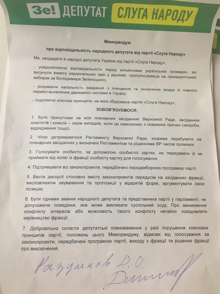 Согласно документу, кандидаты в народные депутаты Украины от партии "Слуга Народа", "осознавая ответственность перед миллионами украинских граждан, которые выдвинули требование кардинальных изменений в государстве, проголосовав на президентских выборах за Владимира Зеленского, понимая срочность задания по очистке и обновлению власти и полной переустановки государственной системы в Украине", обязуются выполнять ряд обязательств.