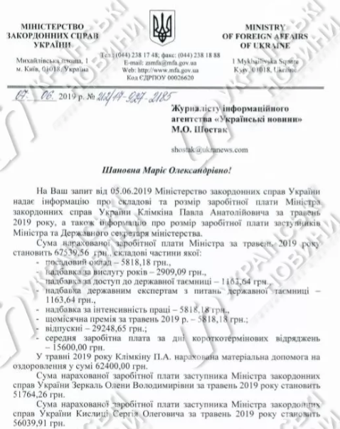 Так, зарплата Климкина за май составила 130 000 гривен при окладе в 5 818 гривен. В прошлом месяце министру начислили 62 400 гривен материальной помощи на оздоровление.