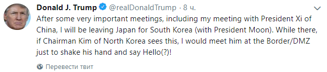 "После несколько очень важных встреч, в том числе с председателем КНР Си Цзиньпином, я отправлюсь из Японии в Южную Корею с президентом Мун Чжэ Ином. Будучи там, если председатель КНДР Ким Чен Ын заинтересован, я встречусь с ним на границе (в демилитаризированной зоне), чтобы пожать ему руку и поздороваться", - написал он в соцсети.