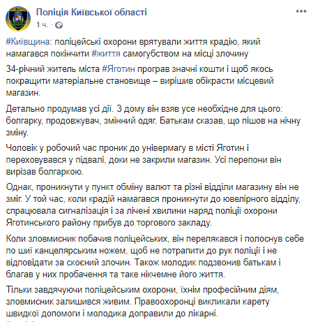 В Киевской области мужчина попытался ограбить магазин, а когда на место преступления приехала полиция, хотел покончить с собой. Об этом сообщает пресс-служба Полиции Киевской области на странице в Facebook.