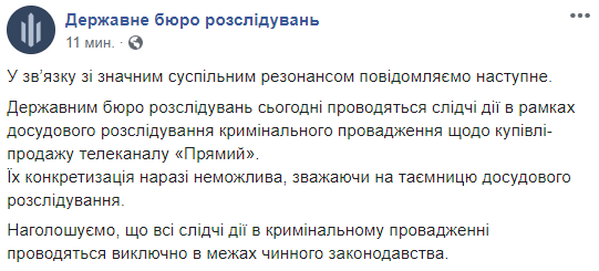 "В связи со значительным общественным резонансом сообщаем следующее. Государственным бюро расследований сегодня проводятся следственные действия в рамках досудебного расследования уголовного производства по купле-продаже телеканала "Прямой". Их конкретизация пока невозможна, учитывая тайну досудебного расследования. Подчеркиваем, что все следственные действия в уголовном производстве проводятся исключительно в рамках действующего законодательства.