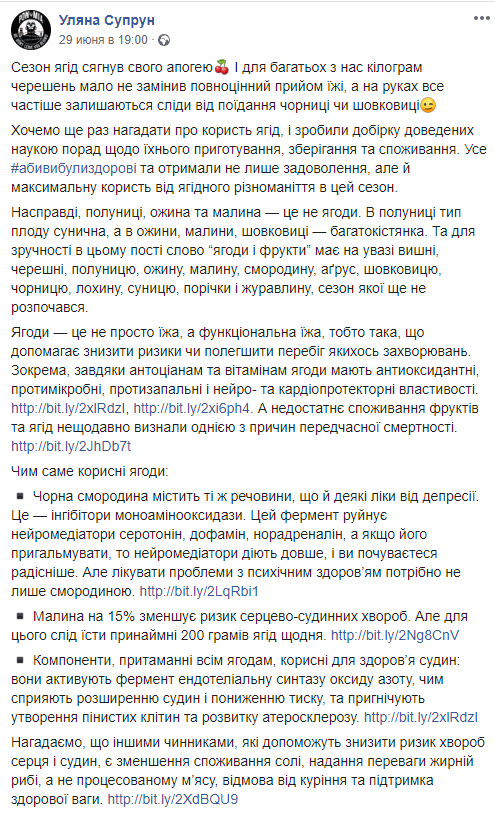 Исполняющая обязанности Ульяна Супрун развеяла несколько популярных мифов о ягодах, а также посоветовала, как правильно есть сезонные плоды. Об этом она сообщила на своей странице в социальной сети Facebook.