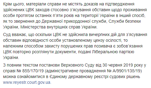 "Суд считает, что поскольку ЦИК не осуществила исчерпывающих действий для выяснения обстоятельств соответствия лица установленного ценза оседлости, то надлежащим способом защиты нарушенных прав истца является обязательство ЦИК повторно рассмотреть документы, представленные Либеральной партией Украины", - говорится в сообщении.