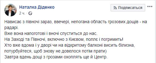 "Нависает с севера сейчас, вечером, неплохая область грозовых дождей - на радаре. Уже она начеку и ночью спустится к нам. На Западе и севере, включая Киев, польет и погремит! Кто уже дома и во дворе или на открытом балконе висит белье, позаботьтесь, чтобы снова не пришлось потом стирать. Завтра днем дожди с грозами охватят еще и Центр", - написала Диденко.