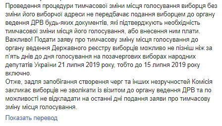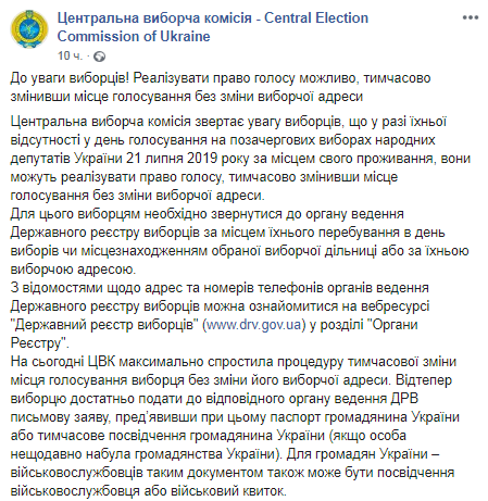 Подать заявление о временном изменении места голосования в орган ведения Государственного реестра избирателей возможно не позднее, чем за пять дней до дня голосования на внеочередных выборах народных депутатов Украины 21 июля 2019 года, то есть до 15 июля 2019 года включительно.