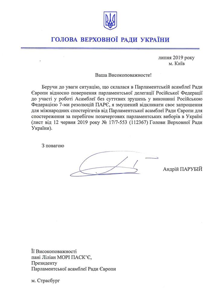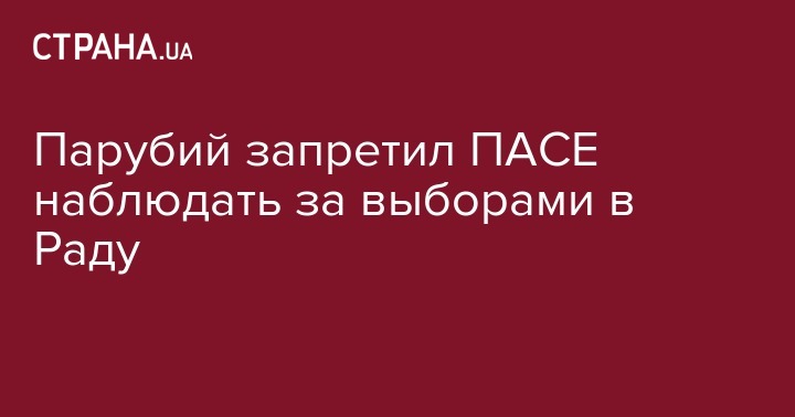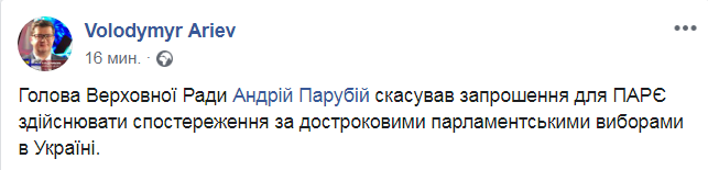 Председатель Верховной Рады Андрей Парубий отменил приглашение для ПАСЕ быть наблюдателями на парламентских выборах 21 июля. Об этом на своей странице в Facebook написал председатель украинской делегации в ПАСЕ Владимир Арьев.