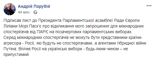 "Подписал письмо к президенту Парламентской ассамблеи Совета Европы Лилианы Мори Паскье об отзыве моего приглашения для международных наблюдателей от ПАСЕ на внеочередных парламентских выборах. Среди международных наблюдателей не могут быть представители страны-агрессора - России, которые будут не наблюдателями, а агентами гибридной войны (президента РФ Владимира – ИФ) Путина. Влияние России на украинские выборы - любым образом - не допустимо", - написал Парубий.