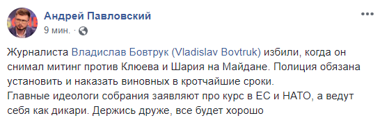 "Журналиста Владислава Бовтрука избили, когда он снимал митинг против Клюева и Шария на Майдане. Полиция обязана установить и наказать виновных в кротчайшие сроки. Главные идеологи собрания заявляют про курс в ЕС и НАТО, а ведут себя как дикари. Держись друже, все будет хорошо", написал в Facebook журналист NewsOne Андрей Павловский.