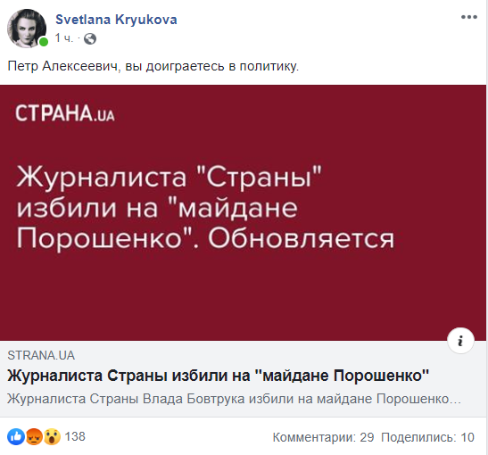 "Петр Алексеевич, вы доиграетесь в политику", - отреагировала на инцидент с избиением в соцсети заместитель главного редактора "Страны" Светлана Крюкова.