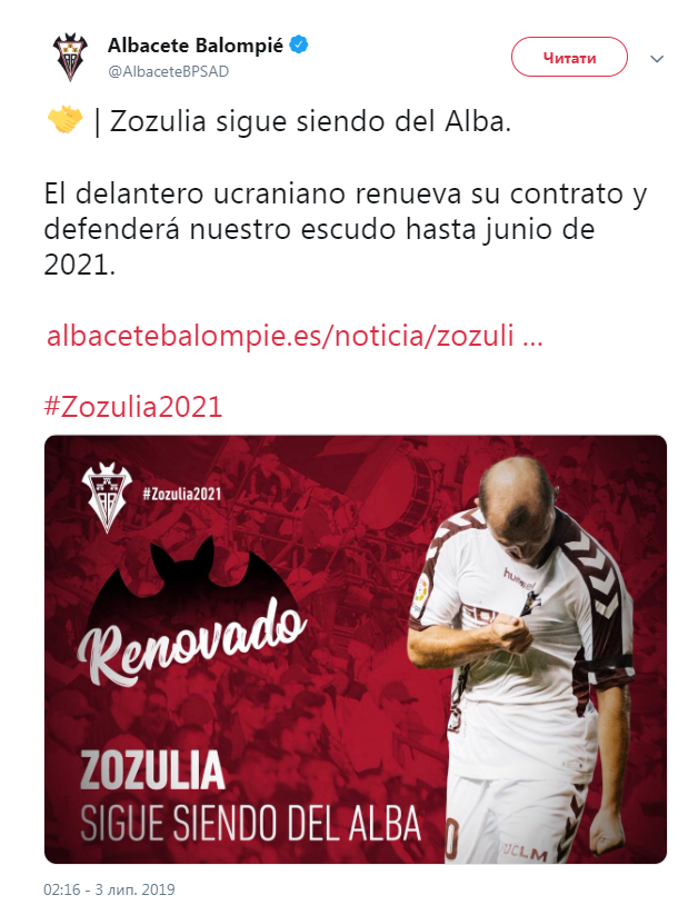 О подписании нового контракта сообщает официальный Twitter клуба. Продленное соглашение Романа Зозули с Альбасете рассчитано на два года.