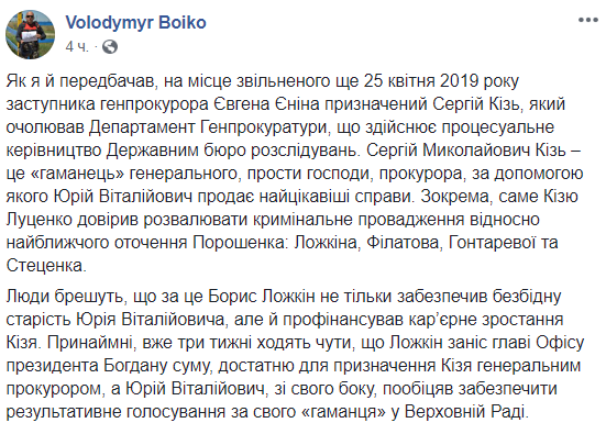 с помощью которого Юрий Витальевич продает интересные дела. В частности, именно Кизю Луценко доверил разваливать уголовное производство в отношении ближайшего окружения Порошенко: Ложкина, Филатова, Гонтаревой и Стеценко".