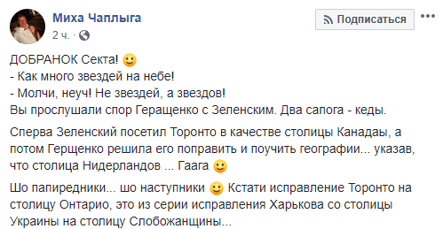 Сперва Зеленский посетил Торонто в качестве столицы Канады, а потом Геращенко решила его поправить и поучить географии... указав, что столица Нидерландов ... Гаага  :)