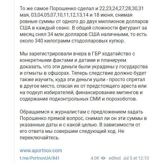 Оказывается, в период инаугурации нового президента, с 17-го по 21-е мая Порошенко снял со счета в этом банке три раза по одному миллиону долларов США. Прямо физически и именно наличными. То же самое Порошенко сделал и 22,23,24,27,28,30,31 мая, 03,04,05,07,10,11,12,13,14 и 18 июня, снимая ровные суммы от одного до двух миллионов долларов США в каждый сеанс. В общей сложности фигурант за месяц снял 34 млн долларов США наличными, то есть около 340 килограмм стодолларовых купюр", - пишет Андрей Портнов.