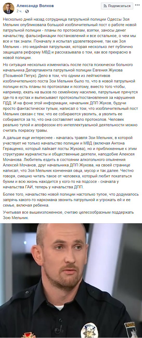 "Началась травля Зои Мельник, в которой участвует не только начальство полиции и МВД (включая Антона Геращенко, который лайкает посты Жукова), но и приближенные к этим структурам журналисты и общественные деятели, наподобие Алексея Мочанова. Любитель ездить в состоянии алкогольного опьянения Алексей Мочанов, друг начальника ДПП Жукова, на своей странице написал, что Зоя Мельник конченная овца, мусор и так далее. Честно говоря, смешно читать такое от человека, который любит покататься бухим и всю жизнь находится у кого-то на подсосе - сначала у начальства ГАИ, теперь у начальства ДПП", - написал он.