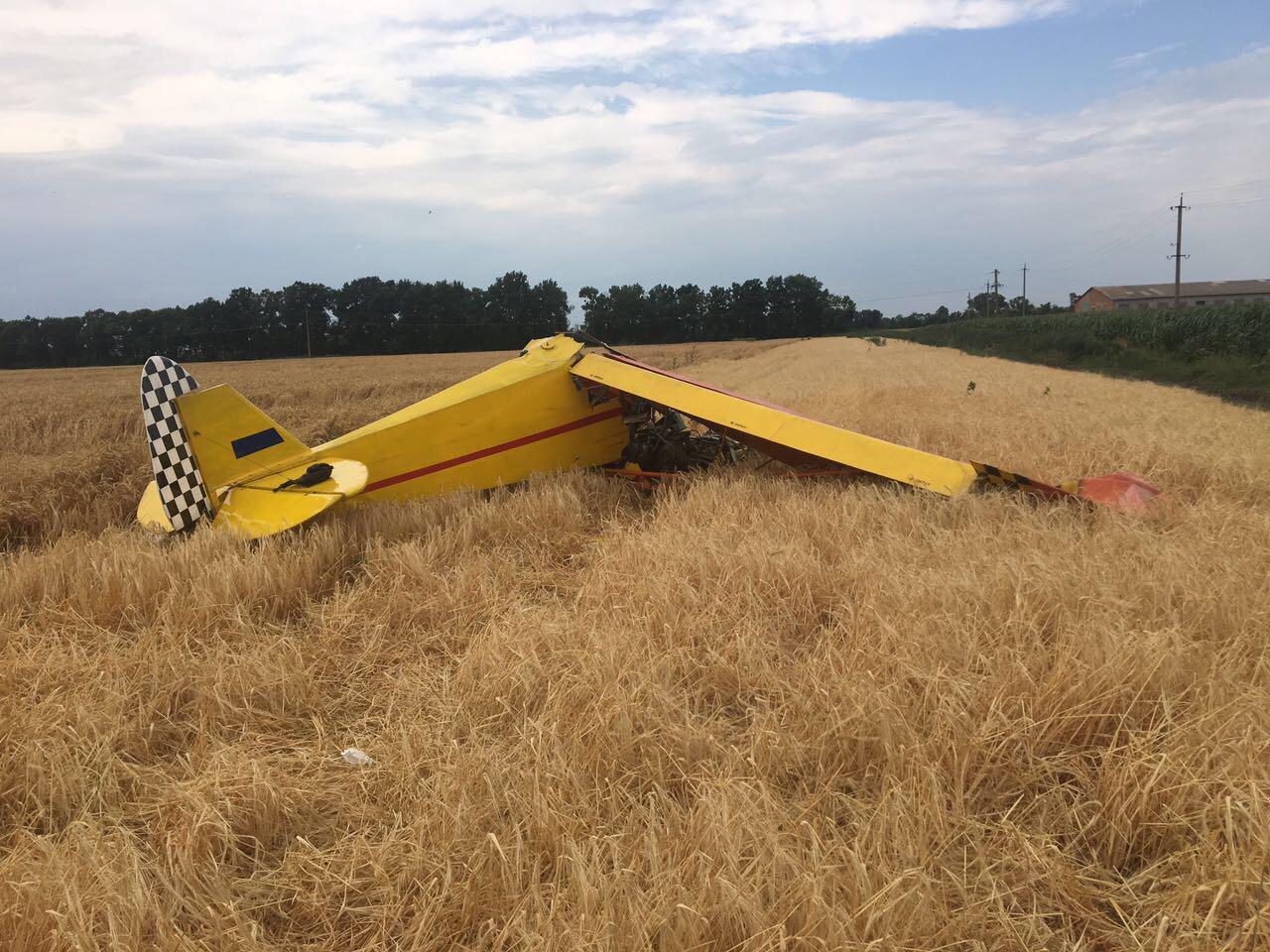 Самолет упал на поле пшеницы в с. Плехов Оржицкого района. На фото видно останки потерпевшего крушение желтого легкомоторного самолета.