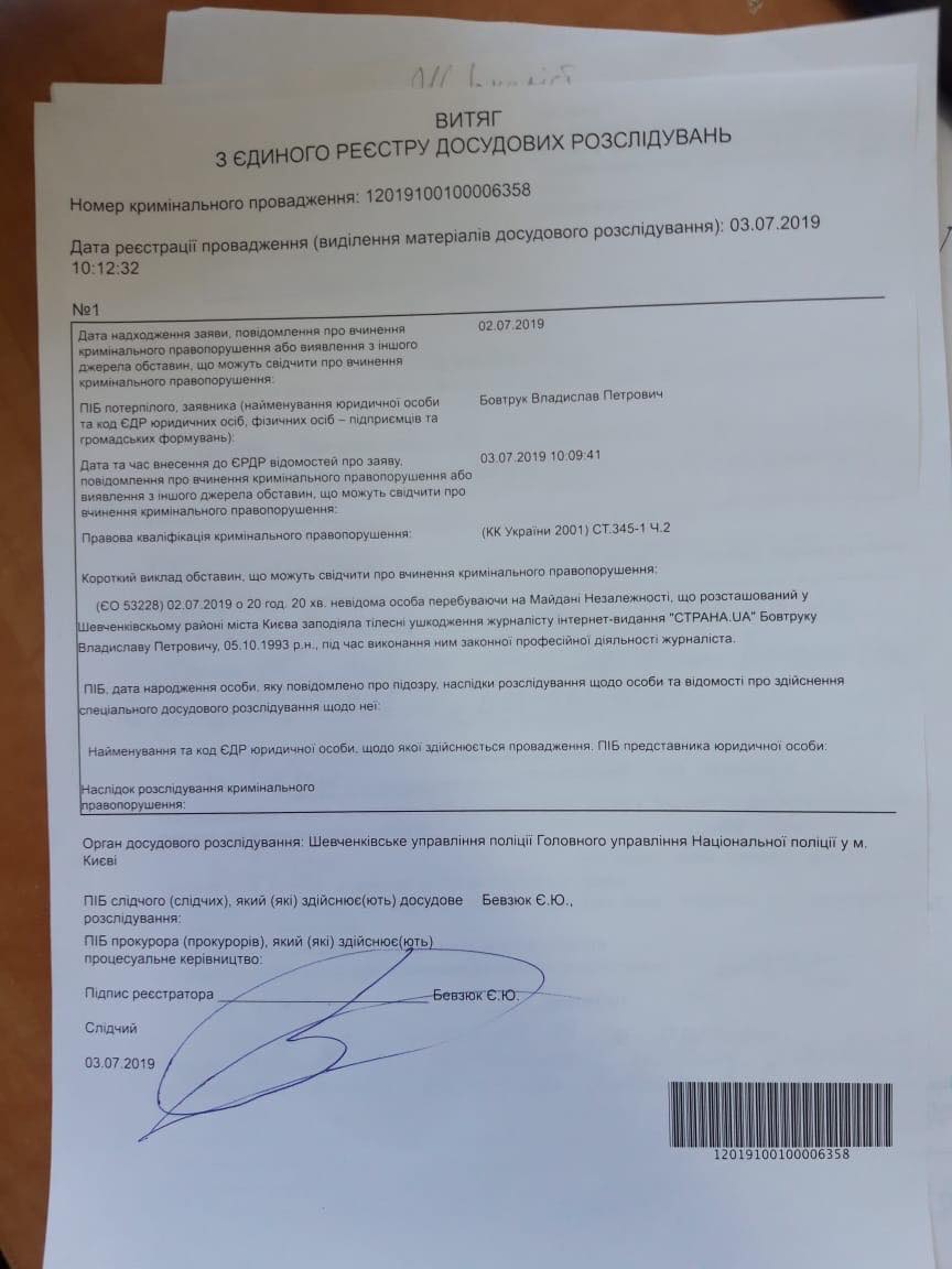 В ЕРДР (единый реестр досудебных расследований) внесена информация о совершении преступления в отношении журналиста и зарегистрировано уголовное производство по признакам преступления, предусмотренного ч. 2 ст. 345-1 УК (умышленное причинение журналисту побоев или легких телесных повреждений, что связано с осуществлением его профессиональной деятельности).