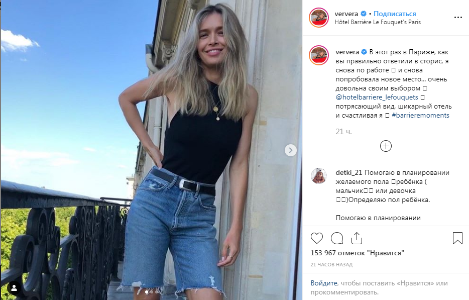 На фотографии певица позирует на балконе и в номере парижской гостиницы. Брежнева одета в джинсовые шорты до колена, черную обтягивающую майку, которая подчеркивает фигуру, и черные вьетнамки. Дополняют повседневный летний лук солнцезащитные очки и черный тонкий пояс.