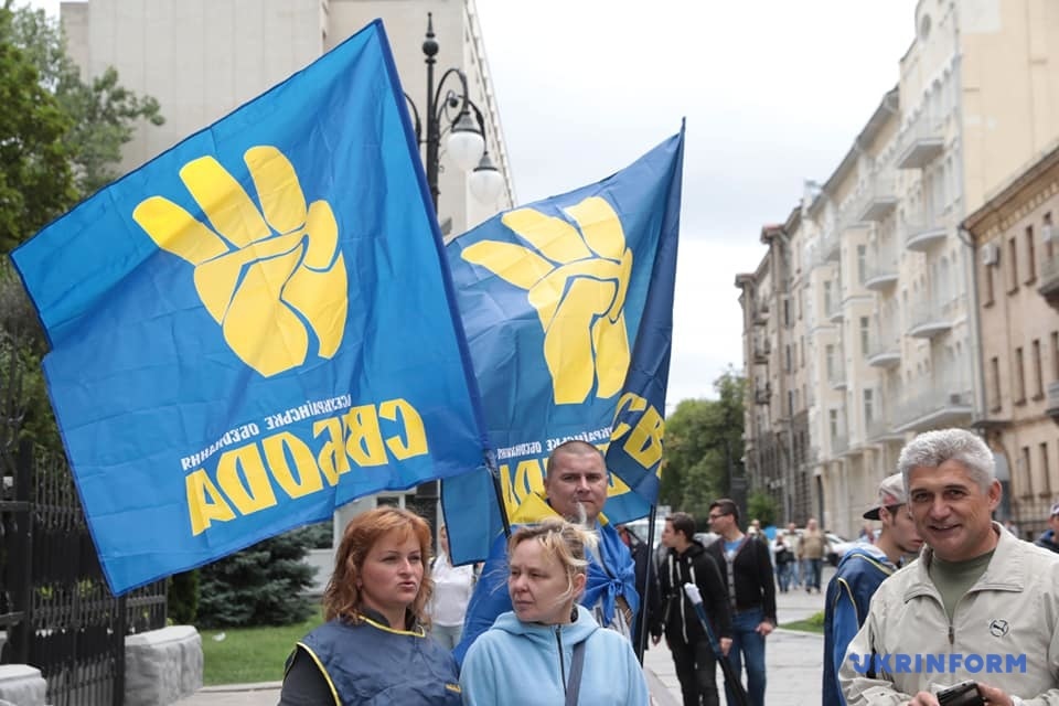 Митингующие держат плакаты с надписями: "Нет - торговле украинской землей!", "Украина - превыше всего!", "Выбор нации - украинизация, декоммунизация, люстрация!", "Украина - превыше всего! Президент, служи украинцам, а не олигархам и оккупантам! ".