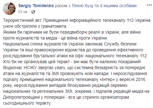 Глава Национального союза журналистов Сергей Томиленко осудил атаку на 112 канал.