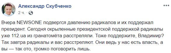"Вчера NEWSONE подвергся давлению радикалов и их поддержал президент. Сегодня окрыленные президентской поддержкой радикалы уже 112.ua из гранатомёта расстреляли. Тоже поддержите, Владимир? Так завтра радикалы и вас расстреляют. Они ведь у нас есть власть, а вы — так ото, громко поговорить лишь", - говорит блогер Александр Скубченко.