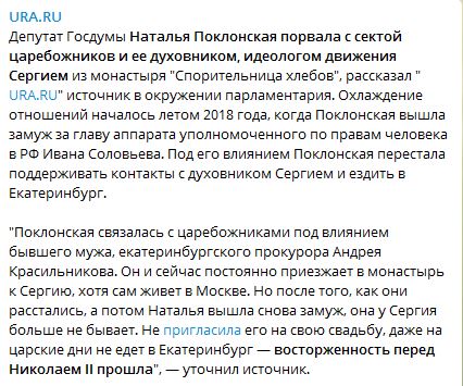 Ранее URA.RU в своем Telegram-канале сообщило, что Поклонская перестала поддерживать контакт с сектой царебожников и Сергием.